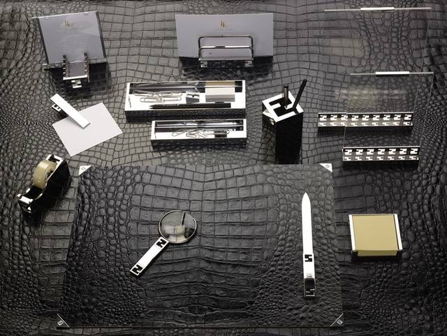 ▲FENDI Casa的DESK SET METAL系列文具,由特殊鳄鱼纹搭配航钛级亮面不锈钢打造而成,并镂雕FF logo设计,相当高雅。